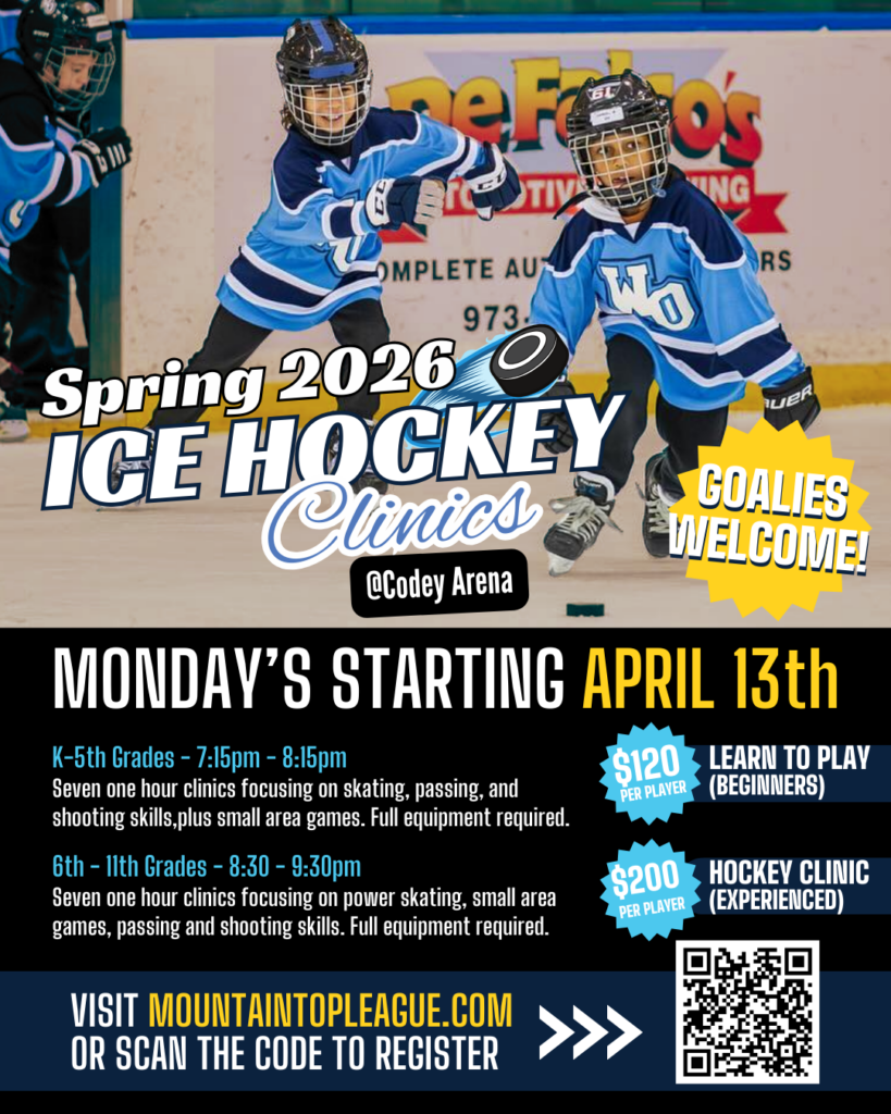 Mountain Top League is excited to announce its Spring 2026 Ice Hockey Clinics, beginning Monday, April 13 at Codey Arena. These clinics are designed to help young players develop their skills in a fun, supportive environment while getting valuable time on the ice.